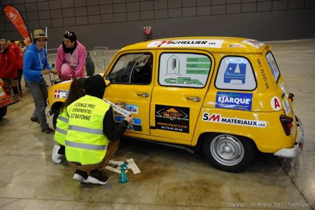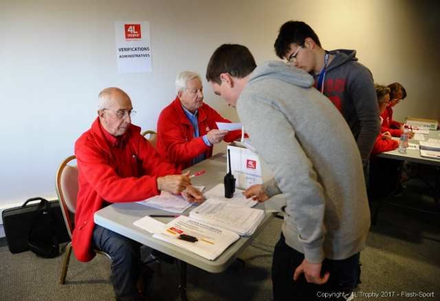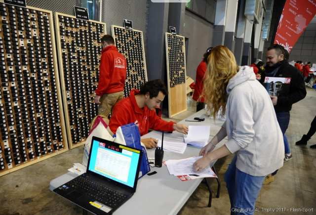 Beaucoup de bénévoles ( ici des étudiants en événementiel ) pour ce départ afin de respecter les prévisions de 1100 contrôles en une journée et 350 le lendemain matin juste avant que Jean-Jacques REY , inventeur et directeur de ce rallye-raid , ne donne le départ .